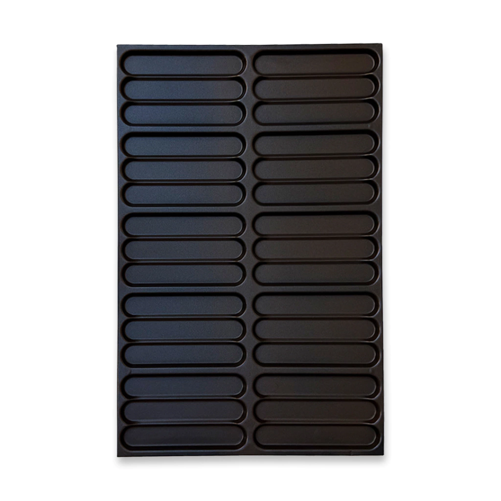 Con capacidad para 30 unidades, esta bandeja resulta adecuada para la elaboración de panes para pancho grande, permitiendo una distribución más precisa de la masa y una mejor repetición de formato. El estampado completo ayuda a conservar la forma de cada pieza durante las distintas etapas de producción.